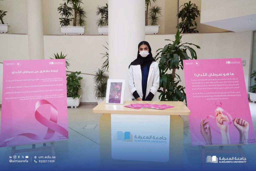 تزامنًا مع الشهر العالمي للتوعية بسرطان الثدي، نفذت إدارة المسؤولية المجتمعية في #جامعة_المعرفة، ممثلةً بفريق سفراء المعرفة، فعالية توعوية للتأكيد على أهمية الكشف المبكر وتعزيز اتباع أساليب الوقاية.