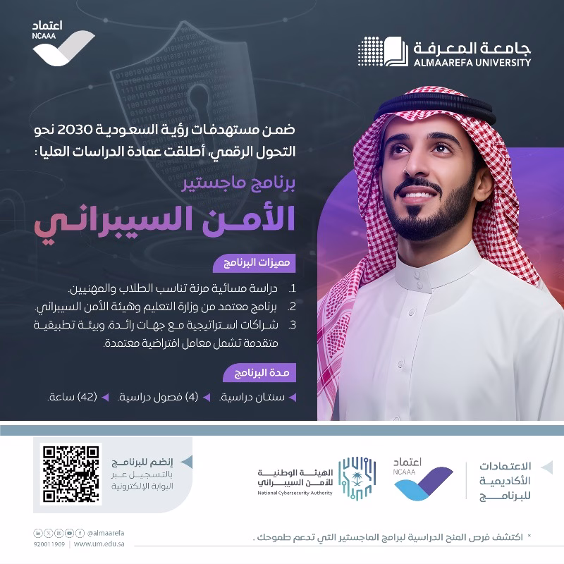 تطلق عمادة الدراسات العليا في #جامعة_المعرفة برنامج ماجستير الأمن السيبراني..
