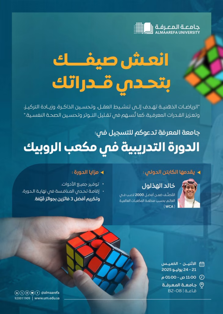 ضمن الفعاليات المقامة للاحتفاء بـ #اليوم_العالمي_لمهارات_الشباب، تنفذ #جامعة_المعرفة دورة تدريبية تهدف إلى تعزيز القدرة الاتصالية والتوافق العصبي العضلي للمتدرب؛ ما يؤدي إلى أداء حركي أفضل. للتسجيل: bit.ly/40VB6qs