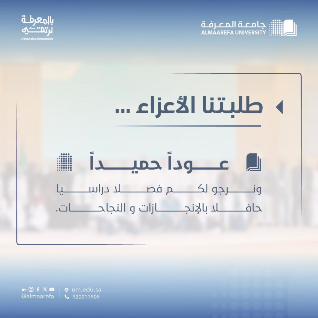 عودًا حميدًا، ونرجو لكم فصلاً دراسيًا مكللاً بالتوفيق والتفوق. pic.twitter.com/Ghd6HS7vtV— جامعة المعرفة (@AlMaarefa) January 12, 2025