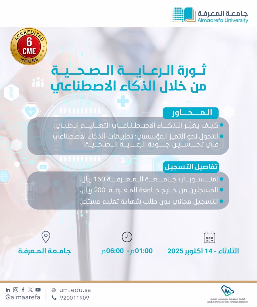 يسر كلية العلوم الطبية بـ #جامعة_المعرفة دعوتكم لحضور ورشة عمل ثورة الرعاية الصحية من خلال الذكاء الاصطناعي.