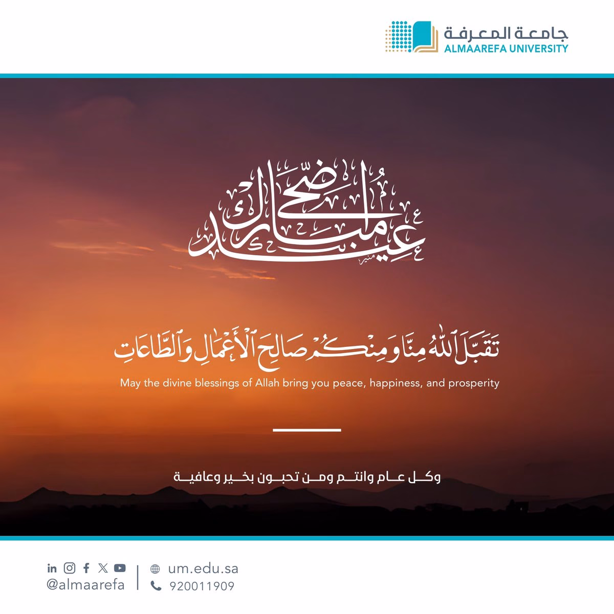 #جامعة_المعرفة تهنئكم بمناسبة حلول #عيد_الأضحى_المبارك ، أعادة الله علينا و عليكم بالخير و اليُمن و البركات ، وكل عامٍ و أنتم بخير . pic.twitter.com/NHnNn8yvI5 — جامعة المعرفة (@AlMaarefa) June 5, 2025