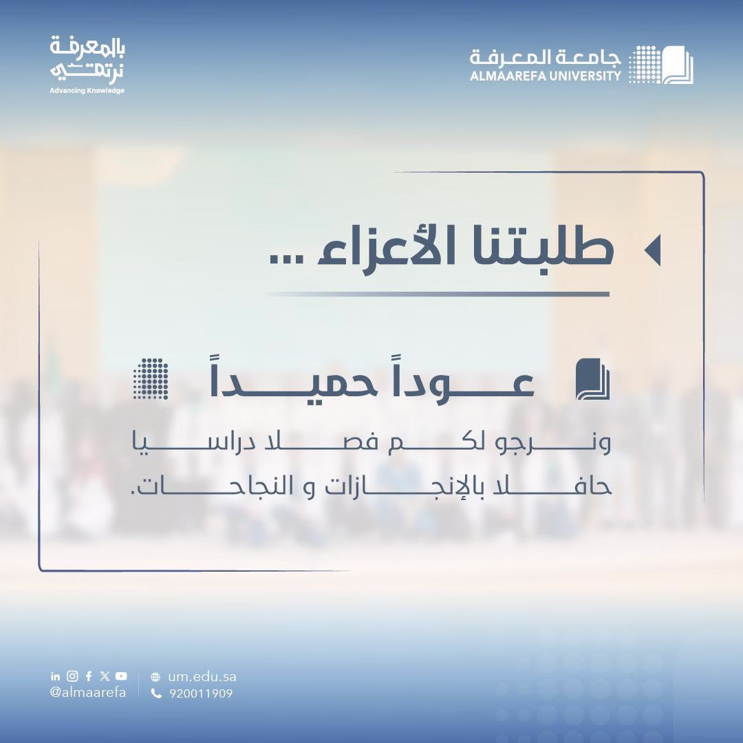 طلبتنا الأعزاء.. عودًا حميدًا، ونرجو لكم فصلاً دراسيًا مكللاً بالتوفيق والتفوق. pic.twitter.com/Ghd6HS7vtV — جامعة المعرفة (@AlMaarefa) January 12, 2025