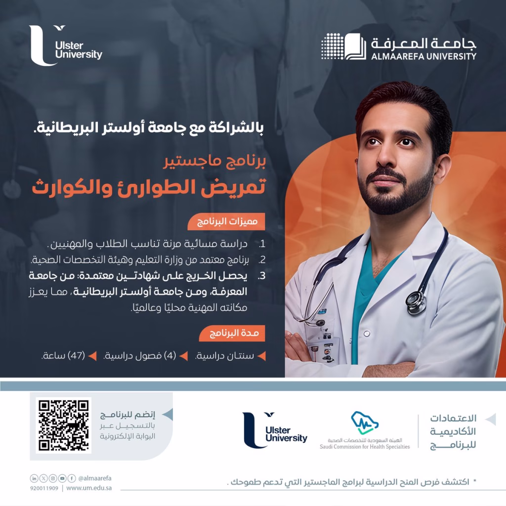 تقدم #جامعة_المعرفة بالشراكة مع جامعة أولستر البريطانية، برنامج “ماجستير تمريض الطوارئ والكوارث”؛ لتأهيل كفاءات متخصصة في إدارة الحالات الحرجة، وتعزيز البحث العلمي والممارسة المهنية في هذا القطاع الحيوي. للتسجيل: pic.