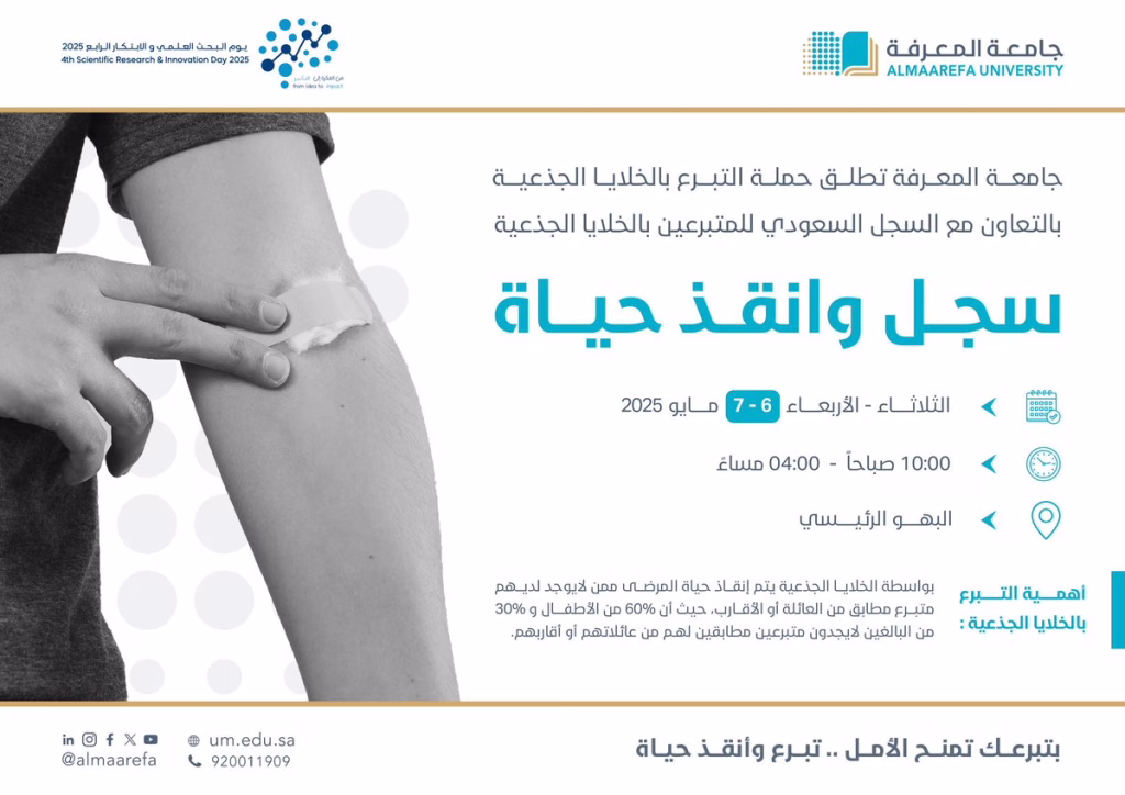 في إطار التزام #جامعة_المعرفة بالخدمة المجتمعية وتعزيز الوعي الصحي.. #جامعة_المعرفة تطلق حملة التبرع بالخلايا الجذعية بالتعاون مع السجل السعودي للمتبرعين بالخلايا الجذعية. #سجل_وأنقذ_حياة