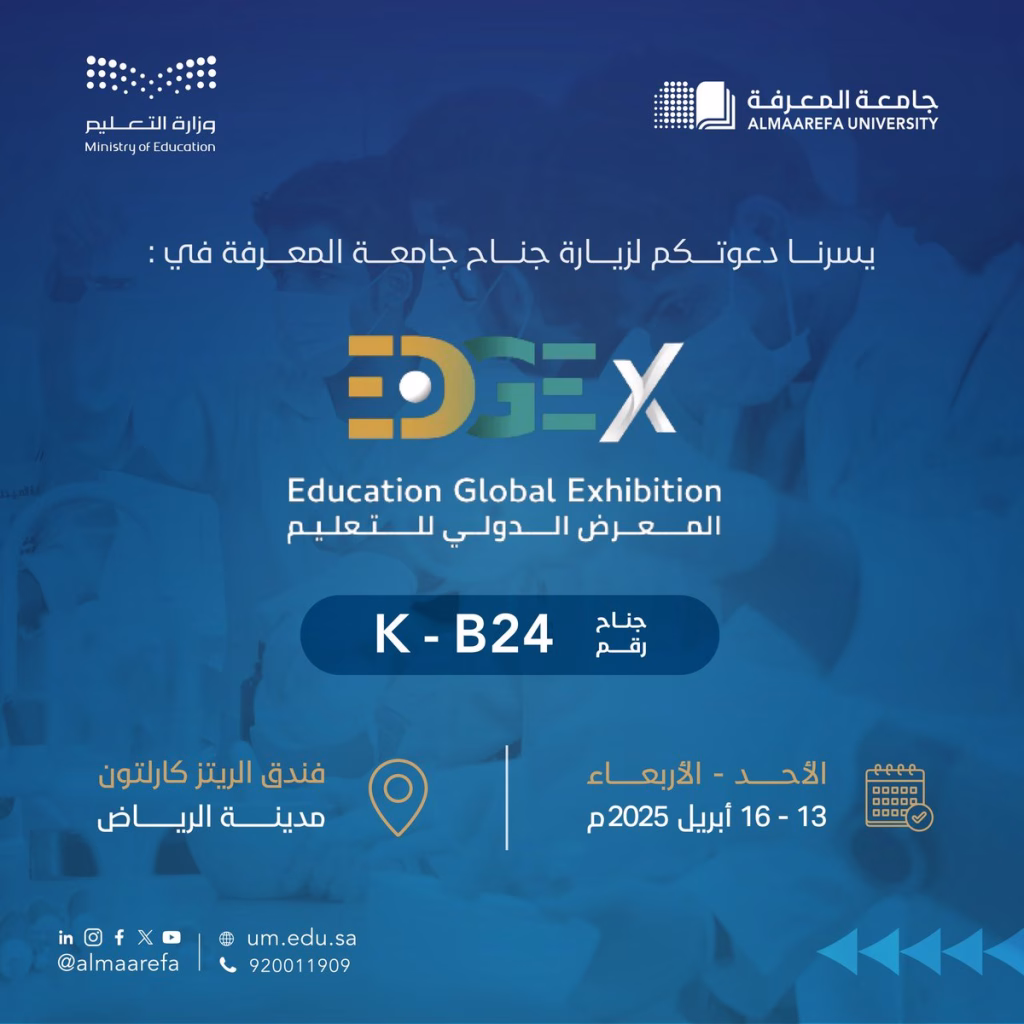 We are pleased to Almaarefa university دعوتكم لزيارة جناحنا في #المعرض_الدولي_للتعليم #EDGEx للتعرف على برامجنا الأكاديمية، نتطلع لزيارتكم.#ما_بعد_الاستعداد_للمستقبل#FutureOfLearning