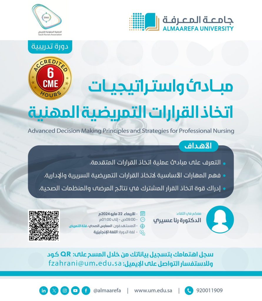 . Almaarefa university In partnership with @SNAorg organizes “The Principles and Strategies for Making Professional Nursing Decisions” course.