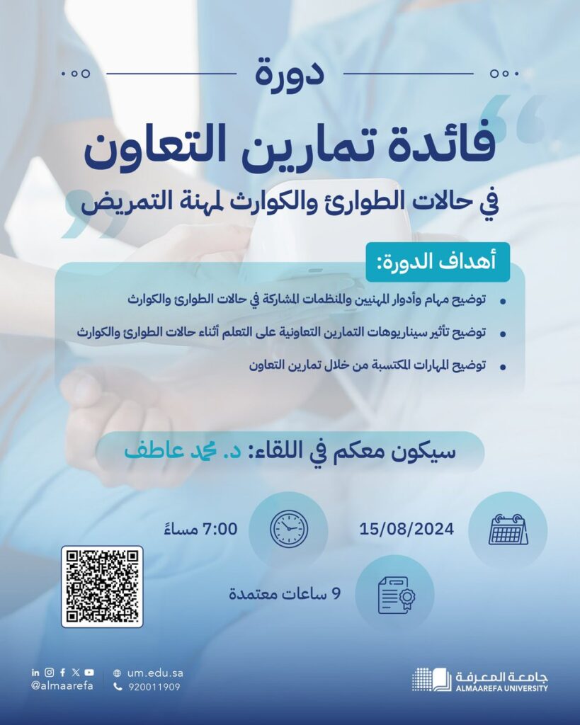 . Almaarefa university In partnership with @SNAorg Course “The Benefits of Emergency and Disaster Cooperation Exercises for the Nursing Profession”.