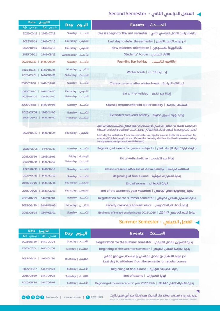 Almaarefa University announces the academic calendar for the academic year 1446, corresponding to 2024-2025.