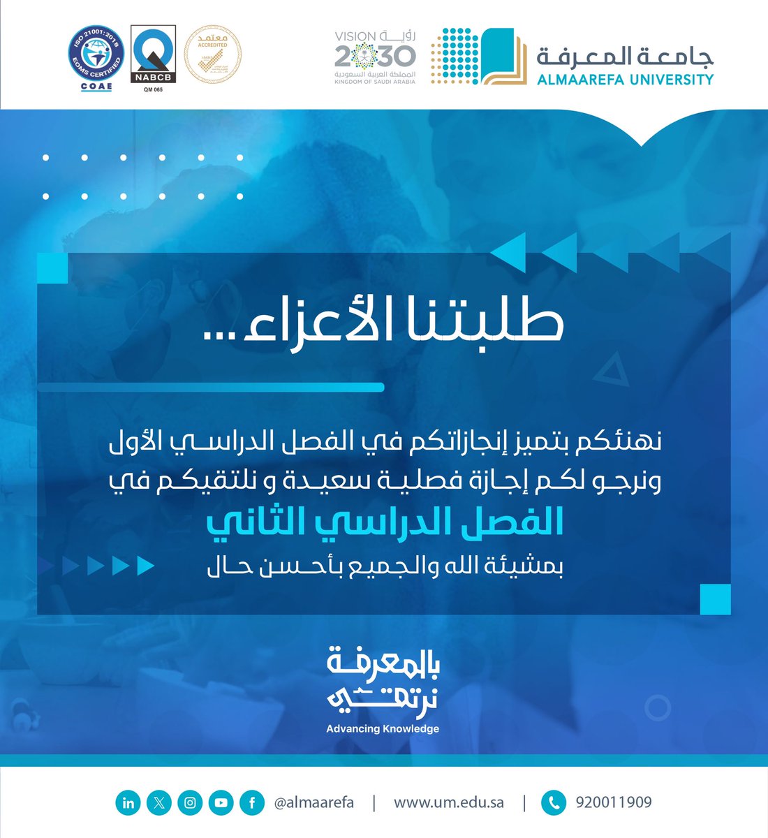 Dear students of #, Al-Maarifa University... We congratulate you on the excellence of what you have accomplished in the first semester, and we wish you a happy holiday. pic.twitter.com/JrdEyyc8Dq — Al Maarefa University (@AlMaarefa) January 5, 2024