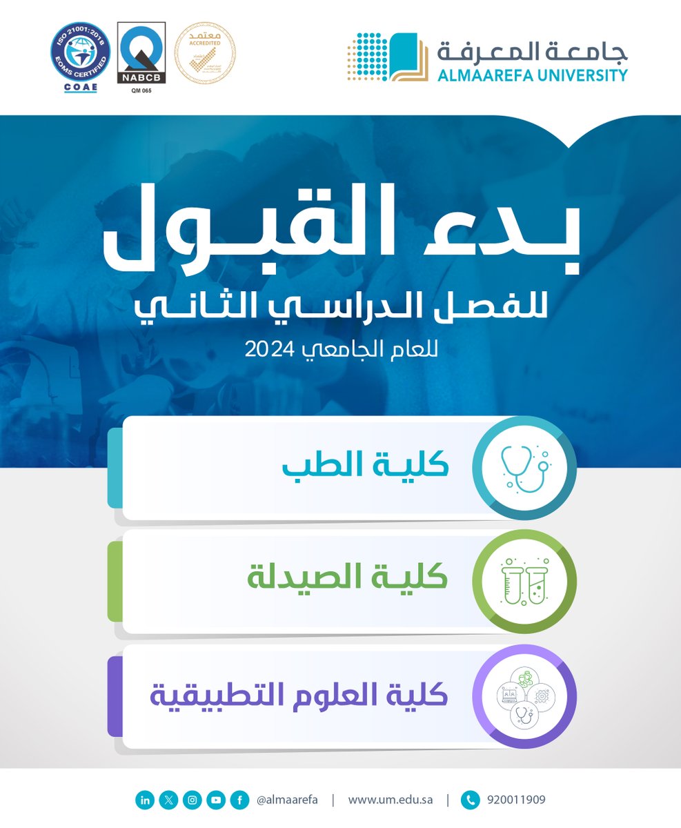 #Al-Maarefa University announces the continuation of admission to bachelor’s programs for the second semester, for the academic year 2024. To register: https://t.co/bg7xXf0v5A pic.twitter.com/WKJ8V1yTKw — Al-Maarefa University (@AlMaarefa) January 10, 2024
