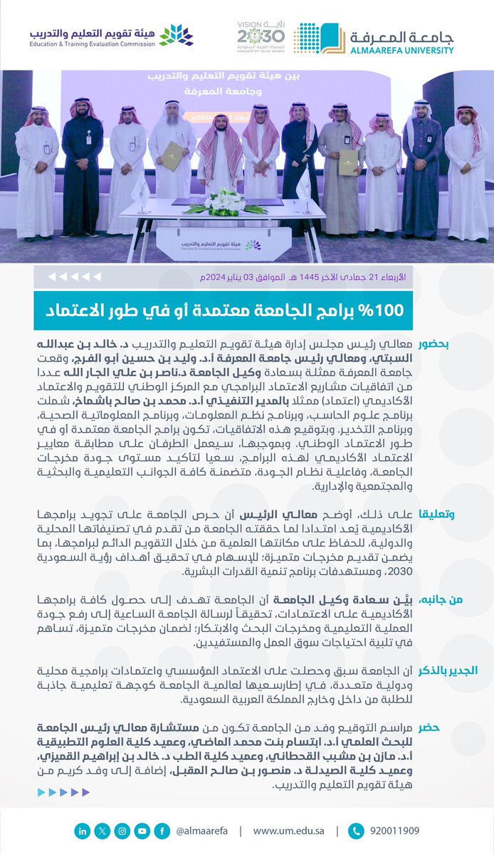 As part of #_Knowledge_University’s continuous endeavor to improve its outcomes, the university signs a number of programmatic accreditation project agreements with the National Center for Academic Accreditation and Evaluation (Etimad). @AlMaarefa @EtecNcaaa pic.twitter.com/NY8UFWaxHp — Knowledge University (@AlMaarefa) January 3, 2024