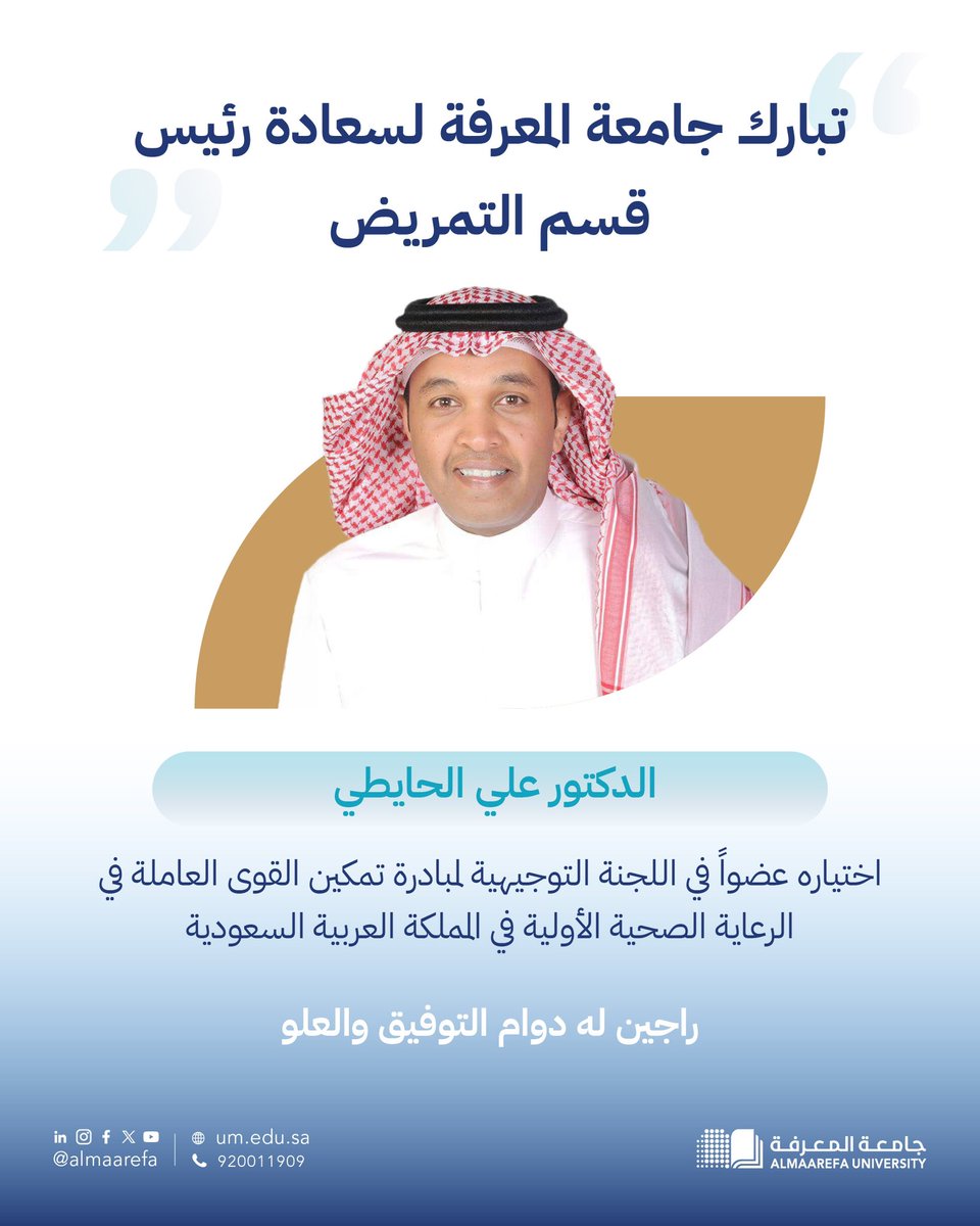 In recognition of the academic and professional excellence of the faculty member at the University of Knowledge, the Head of the Nursing Department, Dr. Ali Al-Haiti, has been elected as a member of the Steering Committee of the Primary Health Care Workforce Empowerment Initiative. This initiative aims to enhance and develop national practices and policies…