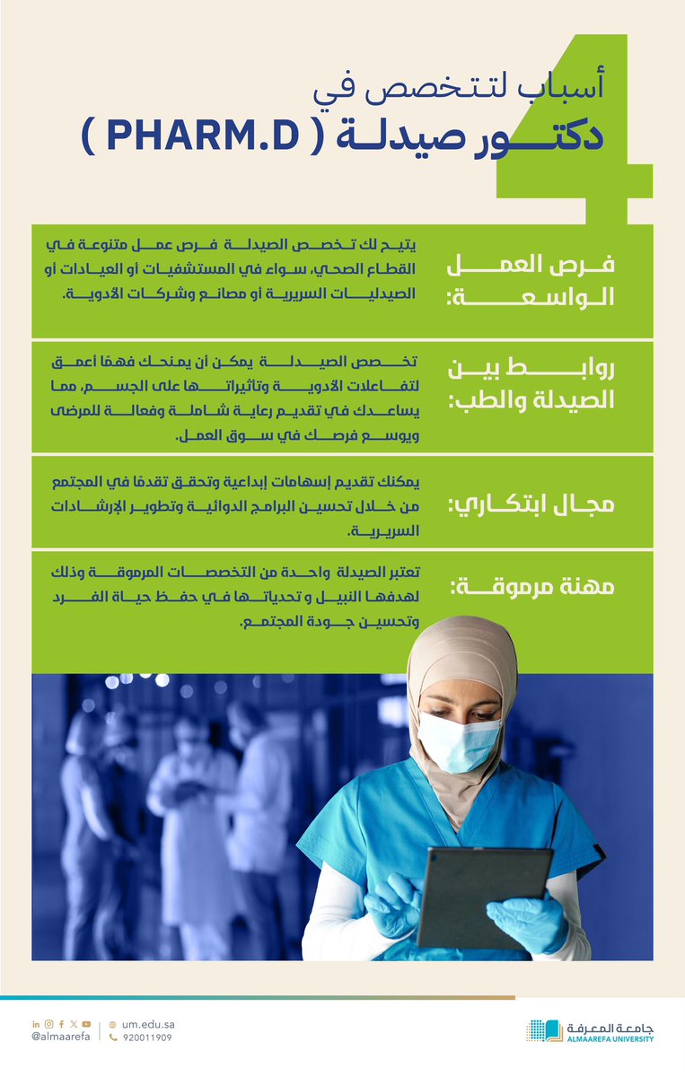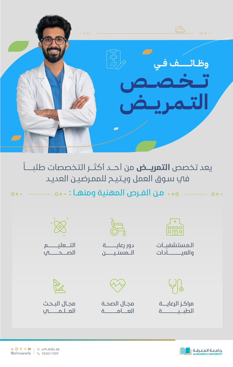 Learn about career opportunities in the # Nursing major with # @MaarefaUniversity. pic.twitter.com/uNUFmiFRx0 — AlMaarefa University (@AlMaarefa) July 31, 2024 The Nursing major – at AlMaarefa University – offers a wide range of career opportunities for graduates, enabling them to play a vital role in the health system. …