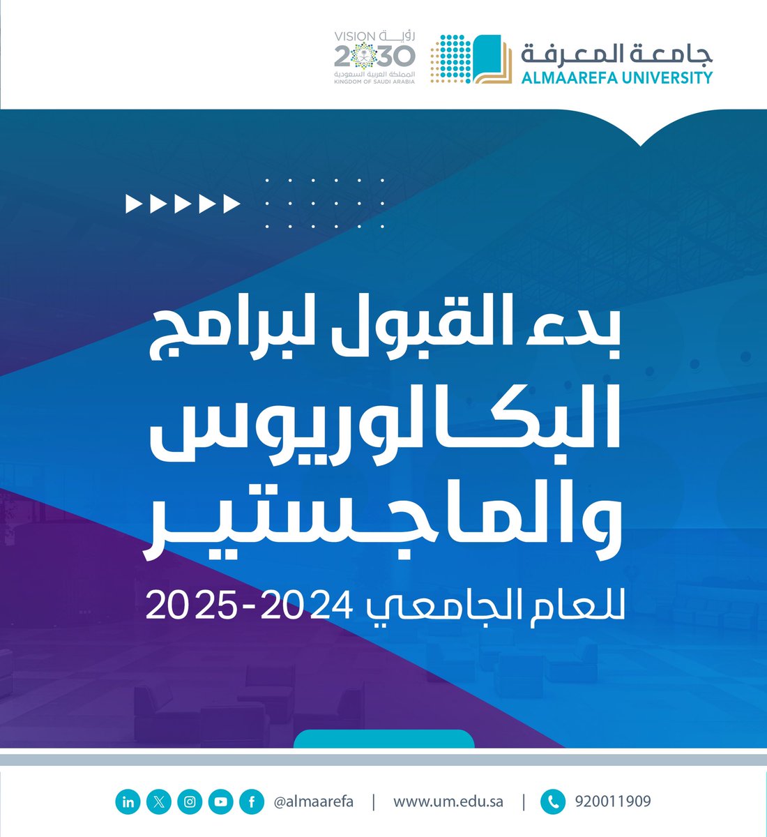 #Al-Maarefa University announces the opening of the admission portal for bachelor’s and master’s programs for the first semester, for the academic year 2024-2025. Registration via the electronic portal: https://t.co/bg7xXf0v5A @AlMaarefa pic.twitter.com/81P9ZwAd2M — Al-Maarefa University (@AlMaarefa) June 23, 2024