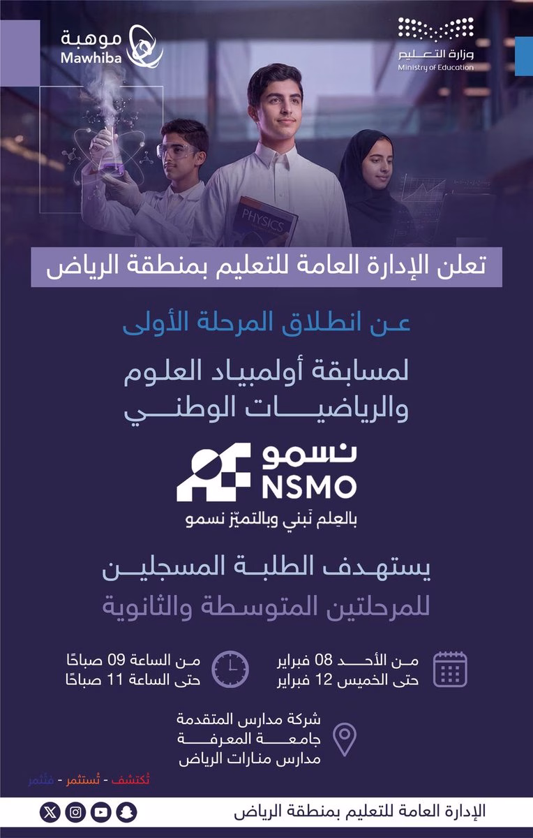تفخر #جامعة_المعرفة باستضافة أبطال أولمبياد العلوم والرياضيات الوطني “نسمو” بالتعاون مع الإدارة العامة للتعليم بالرياض.🗓️ 8 فبراير – 12 فبراير.تمنياتنا بالتوفيق للطلبة المشاركين المبدعين، نحو مستقبلٍ واعد ومشرق. https://t.co/VoktE2M1QK — جامعة المعرفة (@AlMaarefa) February 8, 2026