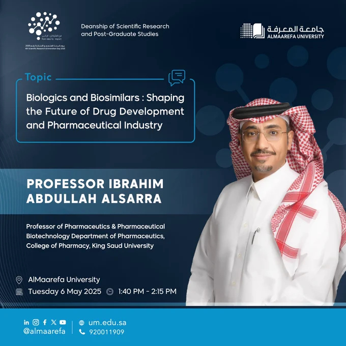 #Almaarefa_University is organizing a scientific meeting in which we will host Prof. Ibrahim bin Abdullah Al-Sarrah to discuss the challenges and future opportunities in the development of the biopharmaceutical industry. For more information:https://t.co/rHbzvq5VuA pic.twitter.com/z4OcAb2INH — جامعة المعرفة (@AlMaarefa) April 29, …