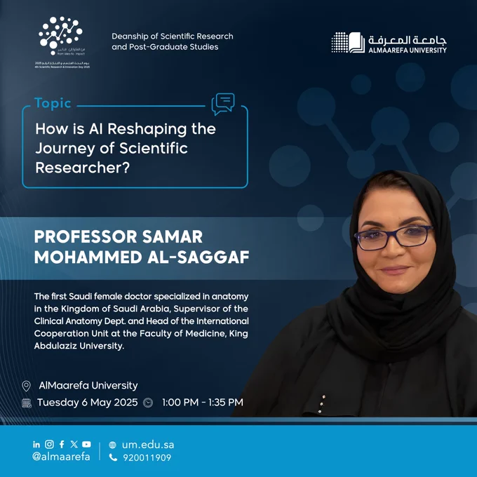 تتشرف #جامعة_المعرفة باستضافة أ.د. سمر محمد السقاف، أول طبيبة سعودية متخصصة في علم التشريح، لتشاركنا تجربتها العلمية المتميزة، وتستعرض أبرز التقاطعات بين البحث العلمي والذكاء الاصطناعي.للمزيد من المعلومات: https://t.co/rHbzvq5nF2 pic.twitter.com/xDOjQFAPBu — جامعة المعرفة (@AlMaarefa) April 29, 2025