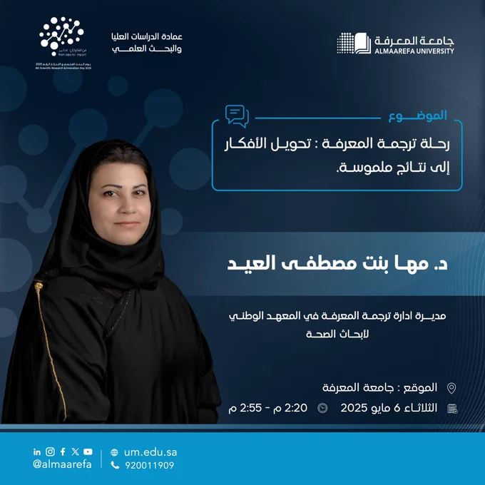#Almaarefa_University is pleased to host Dr. Maha Mustafa Al-Aid, who will discuss the journey of knowledge translation and how to transform creative ideas into tangible results that contribute to community development and enhance the role of scientific research in various… …