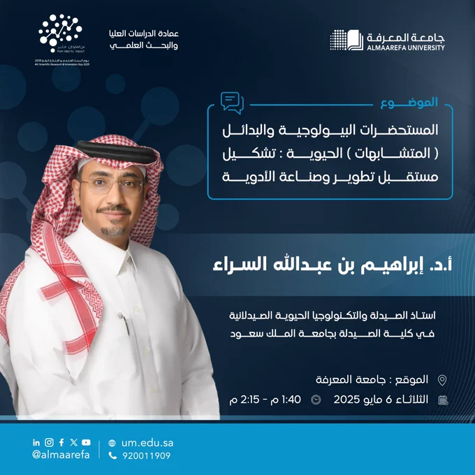 تنظم #جامعة_المعرفة لقاءً علميًا نستضيف فيه أ.د. إبراهيم بن عبدالله السراء، لمناقشة التحديات والفرص المستقبلية في تطوير صناعة الأدوية الحيوية. للمزيد من المعلومات: https://t.co/rHbzvq5nF2 pic.twitter.com/blF36GXowR — جامعة المعرفة (@AlMaarefa) April 29, 2025