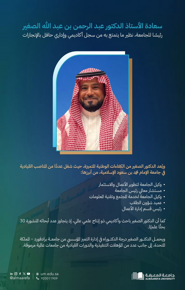 في موقفٍ نعتز به، #جامعة_المعرفة تُرحب بسعادة الأستاذ الدكتور عبدالرحمن بن عبدالله الصغير، رئيس جامعة المعرفة.نسأل الله له التوفيق والسداد في مهمته الجديدة. pic.twitter.com/A8DHOUivaV — جامعة المعرفة (@AlMaarefa) April 12, 2025
