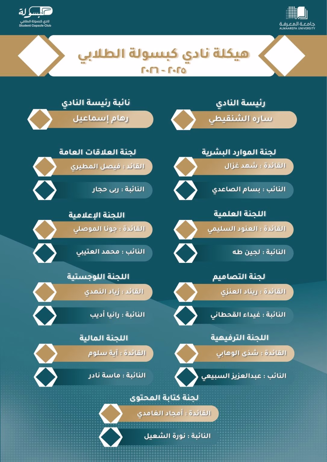 ننـطلق إلى الـعام الجـديد بقيـادات متفـانية تـصنع الأثـر وتـحيي الـعطاء هنا نستعرض لكم هيكلة النسخة الثالثة من نادي كبسولة الطلابي لكلية الصيدلة بجامعة المعرفة. بالخطـى الواثقـة نسعـى لجعـل التجربـة ملهمـة وباقيـة!✨