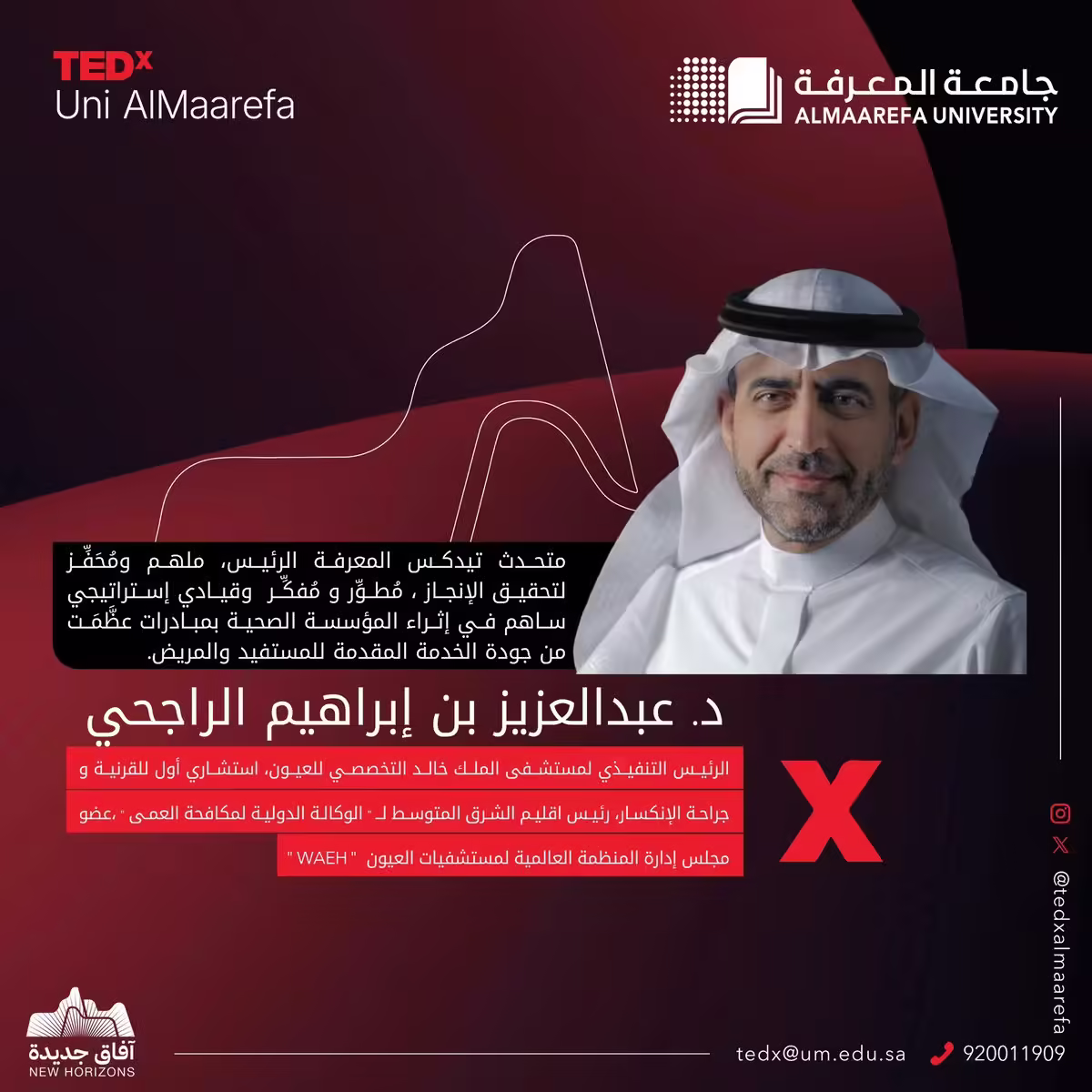 طبيب عيون مُلهم؛ يعالج النظر ليرى ببصيرة. وقائد إداري فَذّ، استبدل الإنسانية بالنظرية الإدارية؛ فأسر مرؤوسيه وأثر! د. عبد العزيز الراجحي @AzAlRajhi فارسنا في #تيدكس_المعرفة؛ ليأسرنا إلهاما. فكونوا في الموعد.(السبت 23 نوفمبر، جامعة المعرفة، 03:30 عصرا) #آفاق_جديدة للتسجيل: https://t.co/92YXToE5J3
