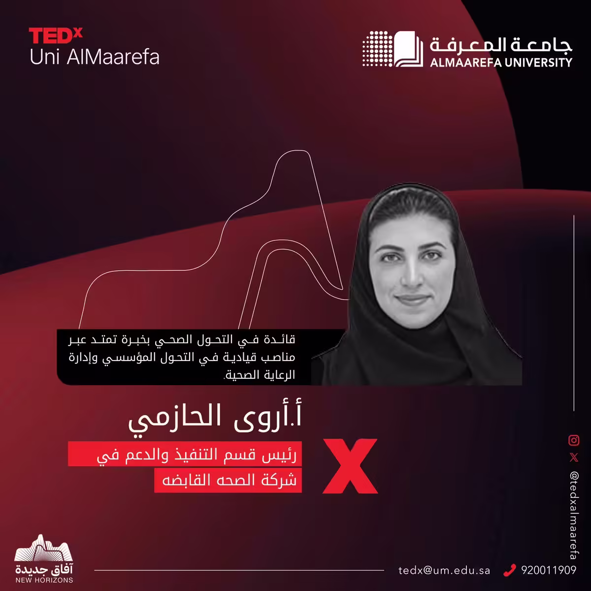 قدرة إدارية متخصصة في بناء القدرات، تمتلك التأهيل العلمي العالي والخبرة النوعية، صنعت لاسمها وجودا تخطى المحلية إلى آفاق عالمية؛ فأصبحت أيقونة مُتفرِّدة في التخطيط الإستراتيجي في المجال الصحي.ستكون أ. أروى الحازمي حديث الإلهام في #تيدكس_المعرفة؛ فكونوا حضورا مُلْهَما .… …