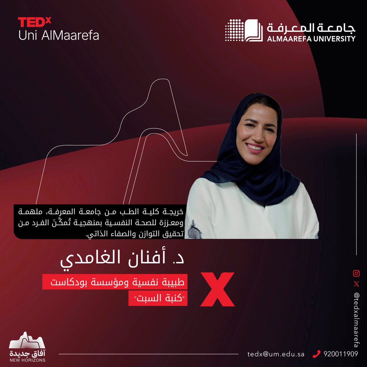 طبيبة مختصة في الصحة النفسية، ومؤلفة، وإعلامية، خَبَرت النفس البشرية علما وسلوكا؛ فنفذت إليها تأثيرا وإلهاما. في #تيدكس_المعرفة، د. أفنان الغامدي @AfnanGh93 تحدثكم حديث النفس للنفس؛ فكونوا في الموعد. (السبت 23 نوفمبر، جامعة المعرفة، 03:30 عصرا) #آفاق_جديدة للتسجيل: https://t.co/MW9IeLZhh6