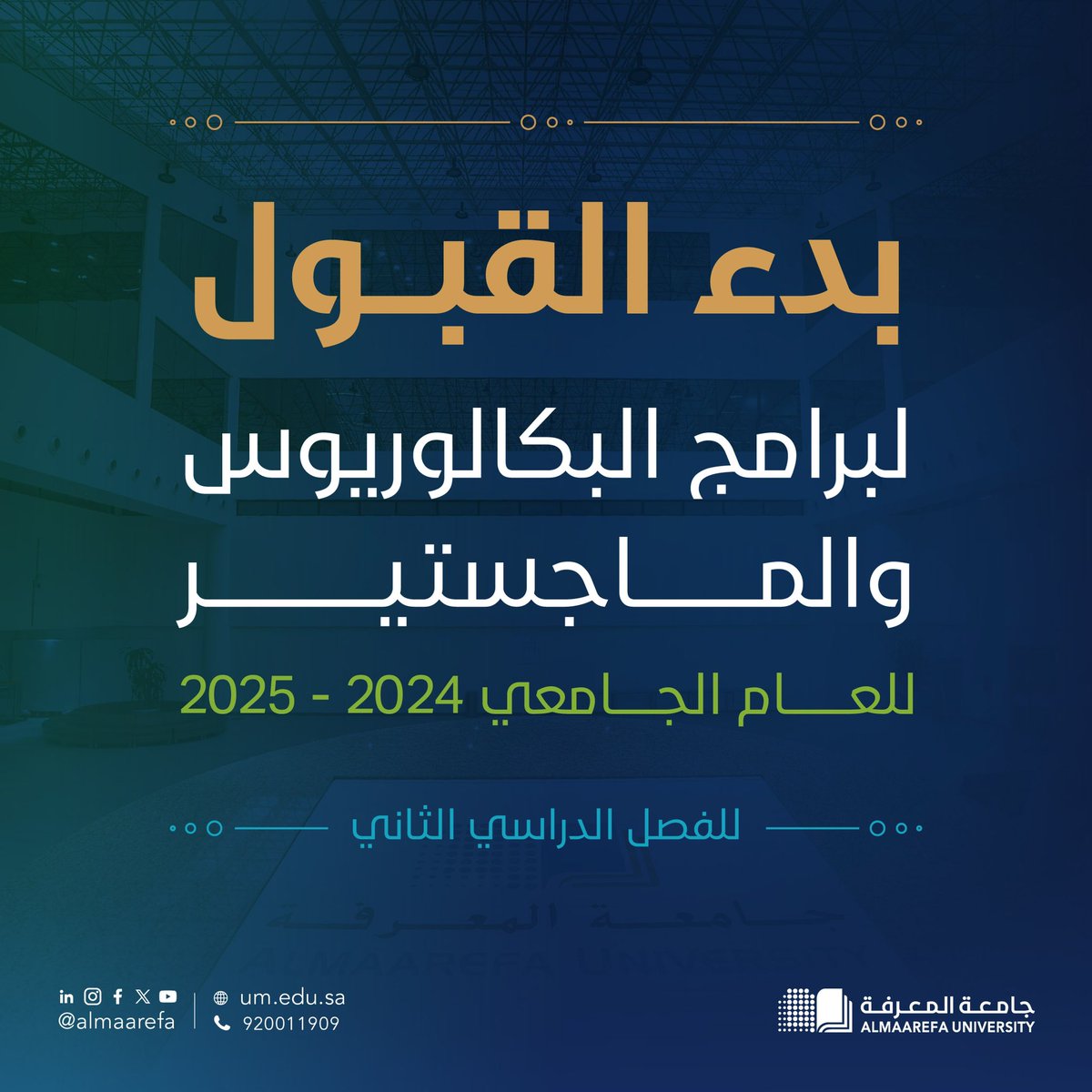 @AlMaarefa: تعلن #جامعة_المعرفة عن بدء القبول لبرامج البكالوريوس و الماجستير للفصل الدراسي الثاني، من العام الأكاديمي 2024 – 2025. للتسجيل :