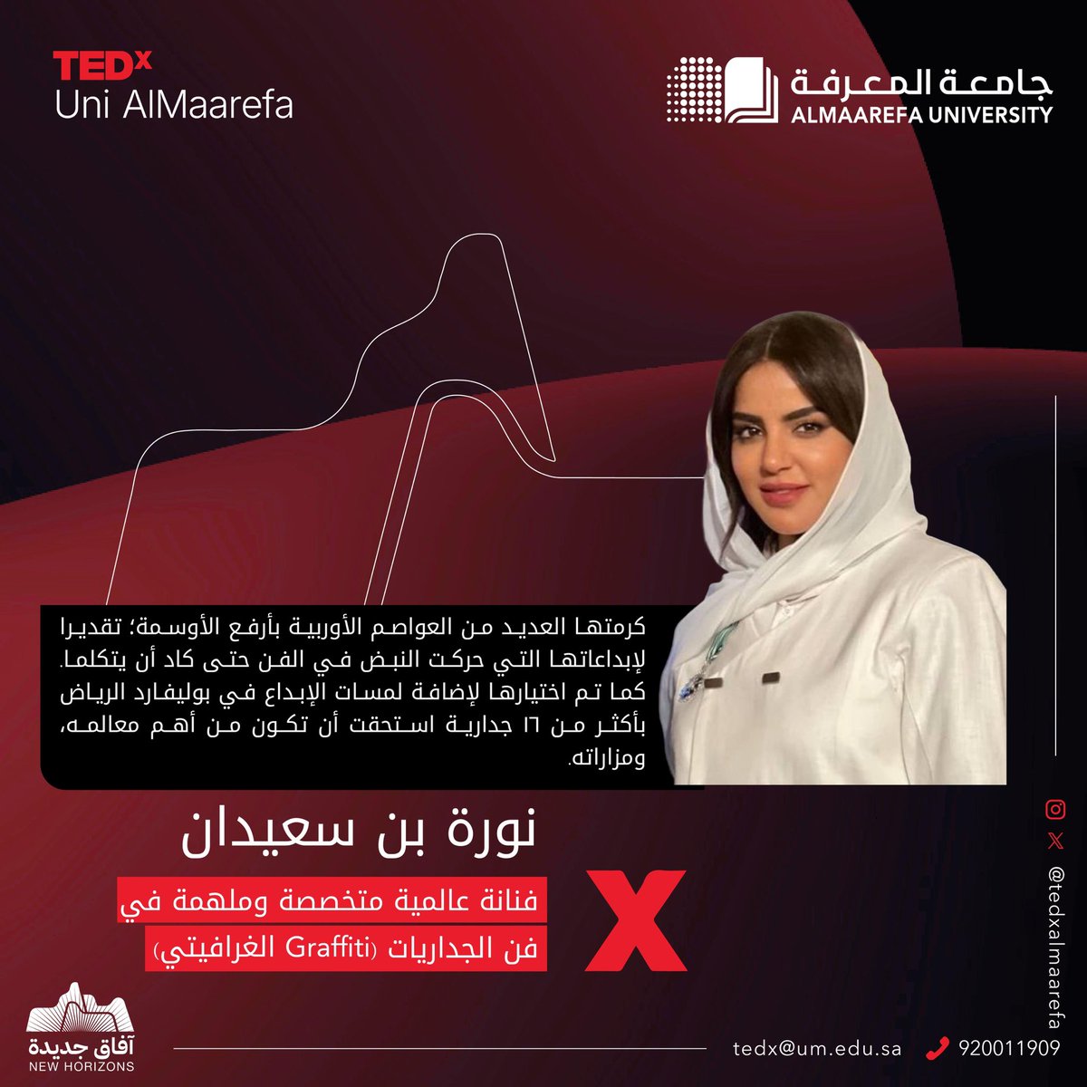 جسَّدَت الفن التشكيلي المحلي أيقونة عالمية؛ فُكرِّمت بالأوسمة الأوربية الرفيعة. في #تيدكس_المعرفة، فنانة الجرافيتي العالمية نورة بن سعيدان @Nourabinsaidan ُتُلهم طموحك بوصفات النجاح.كونوا في الموعد. ( السبت 23 نوفمبر، جامعة المعرفة، 03:30 عصرا ) #جامعة_المعرفة pic.twitter.com/q9I3XI8A17 — جامعة المعرفة (@AlMaarefa) …
