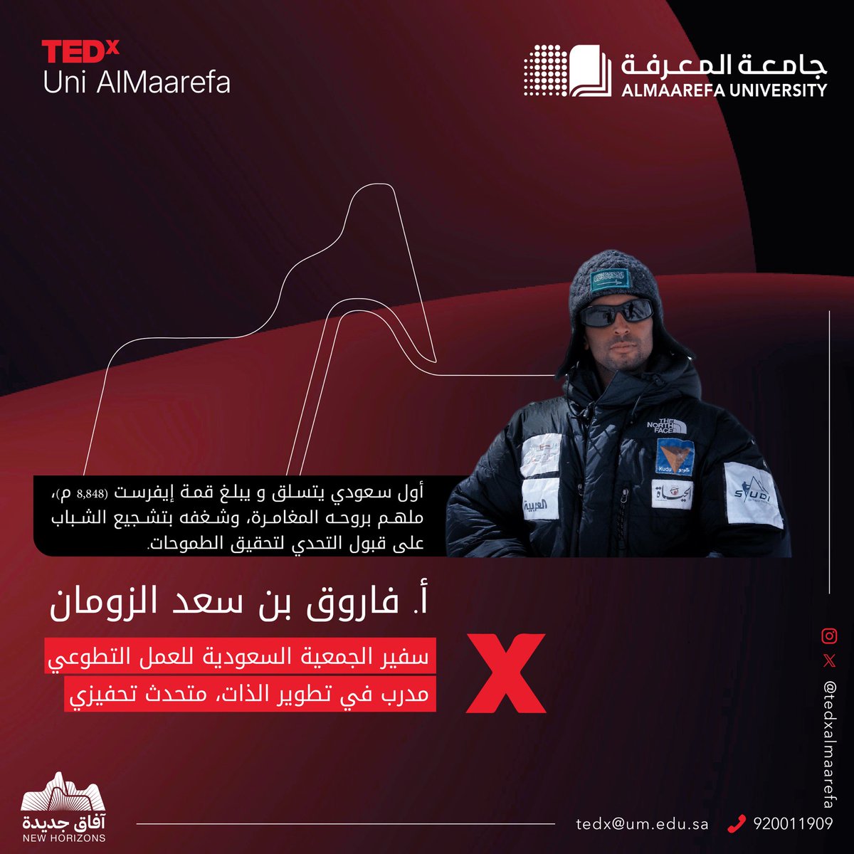 Experience teaches us more about life, and when it is combined with inspirations, it opens up a one-of-a-kind opportunity.#Almaarefa_University invites you to engage in #TEDx_AlMaarefa and be inspired by the experiences.#آفاق_جديدةFor registration:https://t.co/mGruT7A7OA pic.twitter.com/6tzo1CBu13 — جامعة المعرفة (@AlMaarefa) November 13, 2024