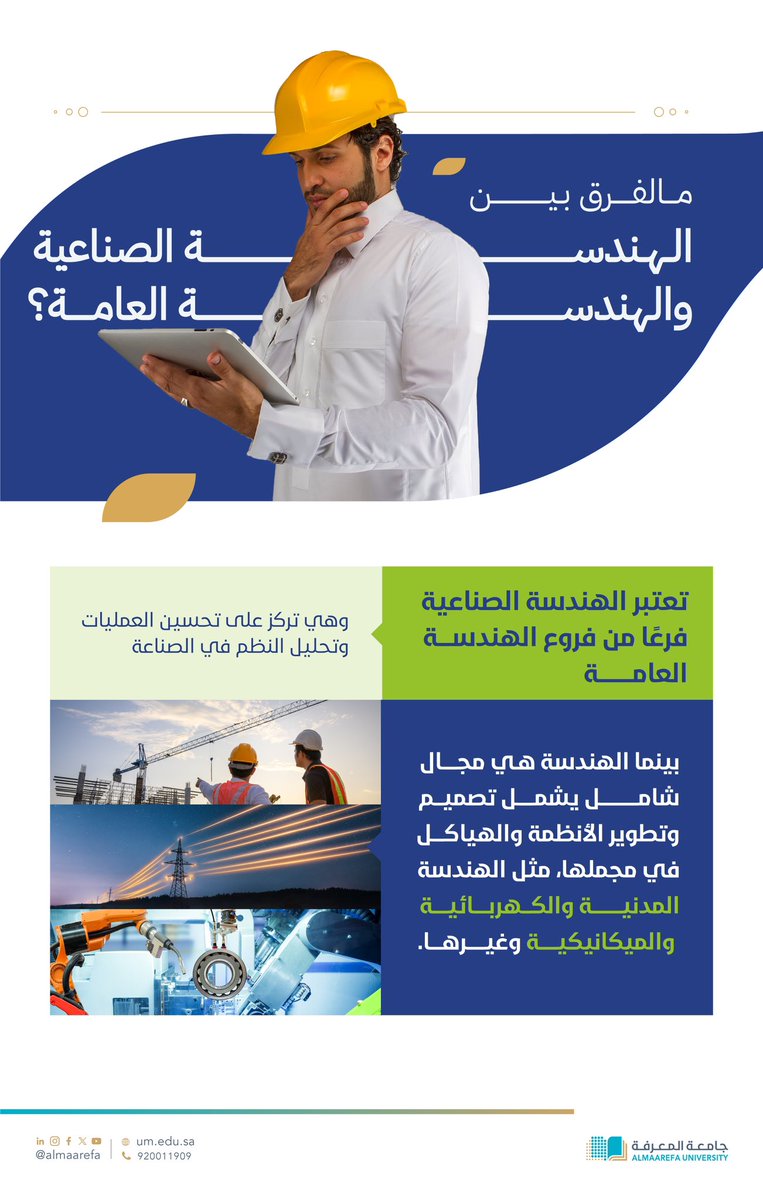 تعرّف على الفرق بين تخصص #الهندسة_الصناعية و #الهندسة_العامة المقدمة من #جامعة_المعرفة. اكتشف المزيد عن التخصص وآلية التسجيل عبر موقعنا الإلكتروني: https://t.co/AHqUqaX1Vb pic.twitter.com/jQPJqG3Iz4 — جامعة المعرفة (@AlMaarefa) July 25, 2024