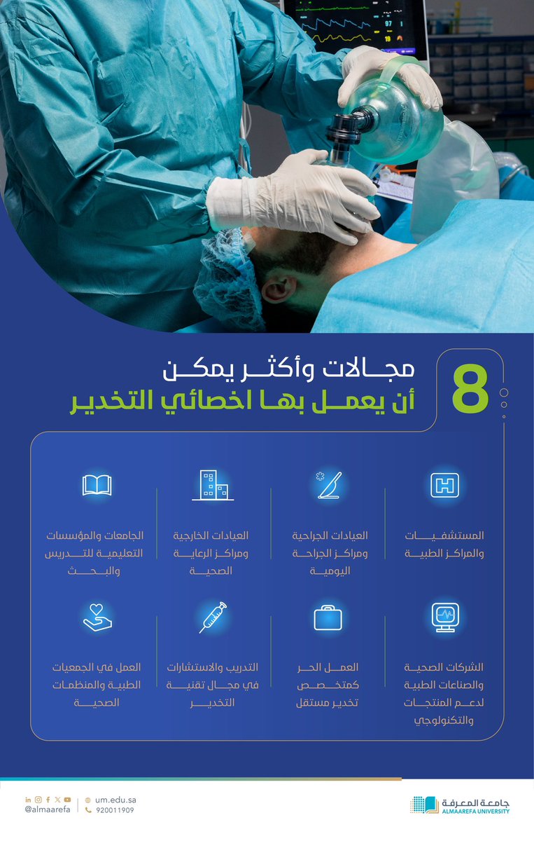 تعرف على المجالات المهنية التي يمكن أن يعمل بها اخصائي #التخدير. pic.twitter.com/TFb3H2UYQt — جامعة المعرفة (@AlMaarefa) July 27, 2024