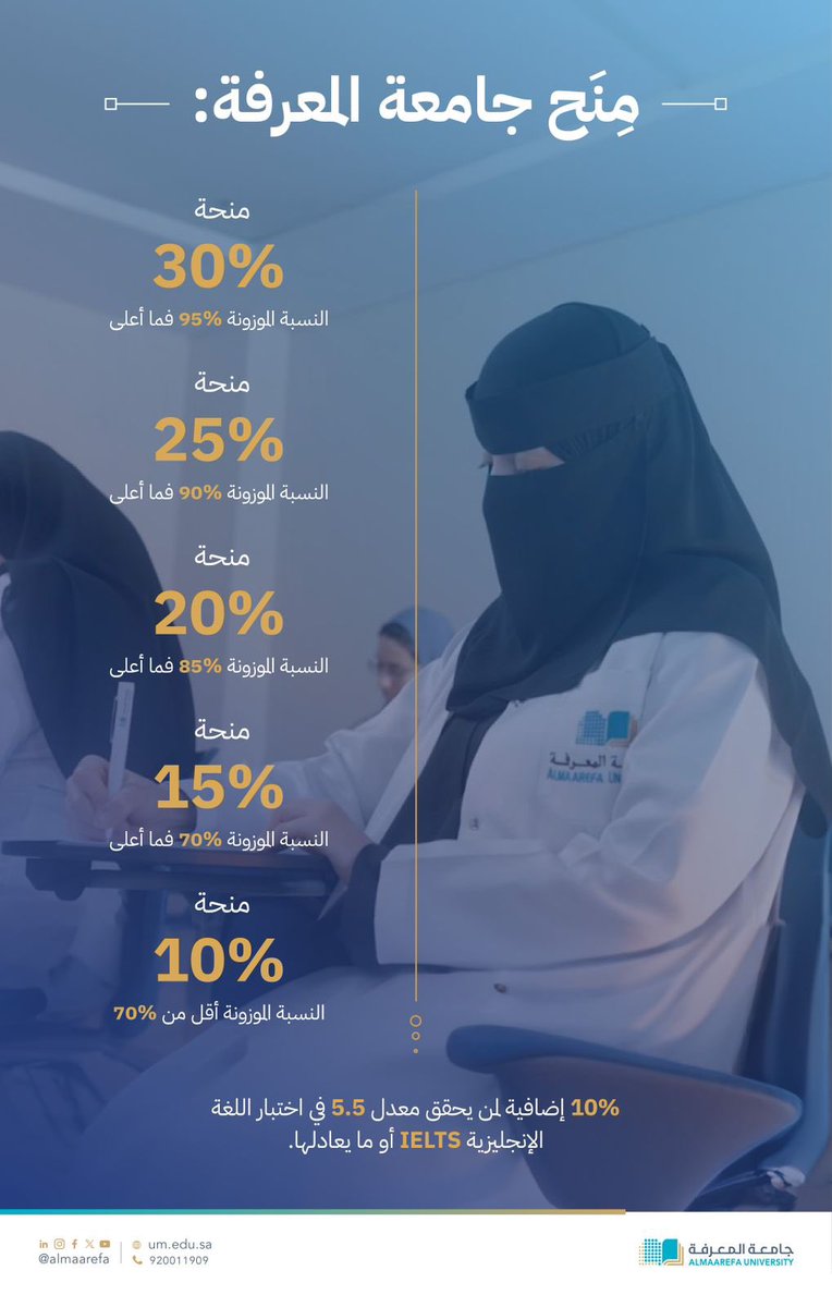 تقدم #جامعة_المعرفة حزمة من منح استقطاب المتميزين للطلبة والطالبات للفصل الدراسي الأول،للعام الجامعيّ 2024-2025.للمزيد، تفضلوا بزيارة الرابط:https://t.co/j7CG1W8fJG@AlMaarefa pic.twitter.com/1wG5kmGYK7 — جامعة المعرفة (@AlMaarefa) July 19, 2024