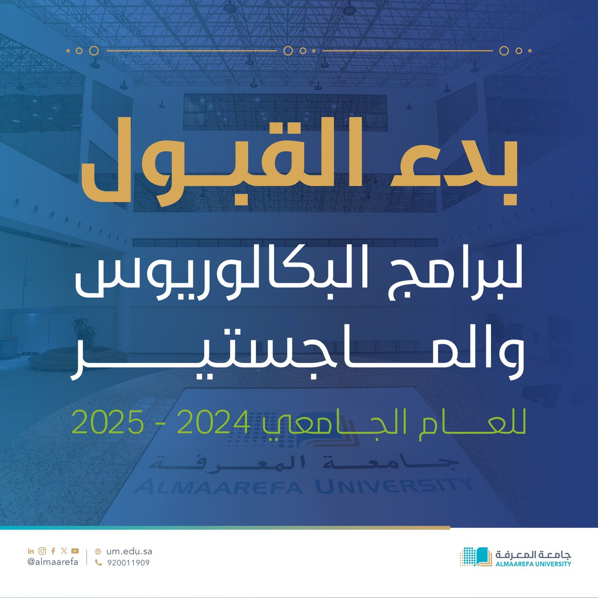 تعلن #جامعة_المعرفة عن استمرار القبول لبرامج البكالوريوس و الماجستير للفصل الدراسي الأول،للعام الجامعيّ 2024-2025. للمزيد حول برامج الجامعة والتسجيل: http://Um.edu.sa