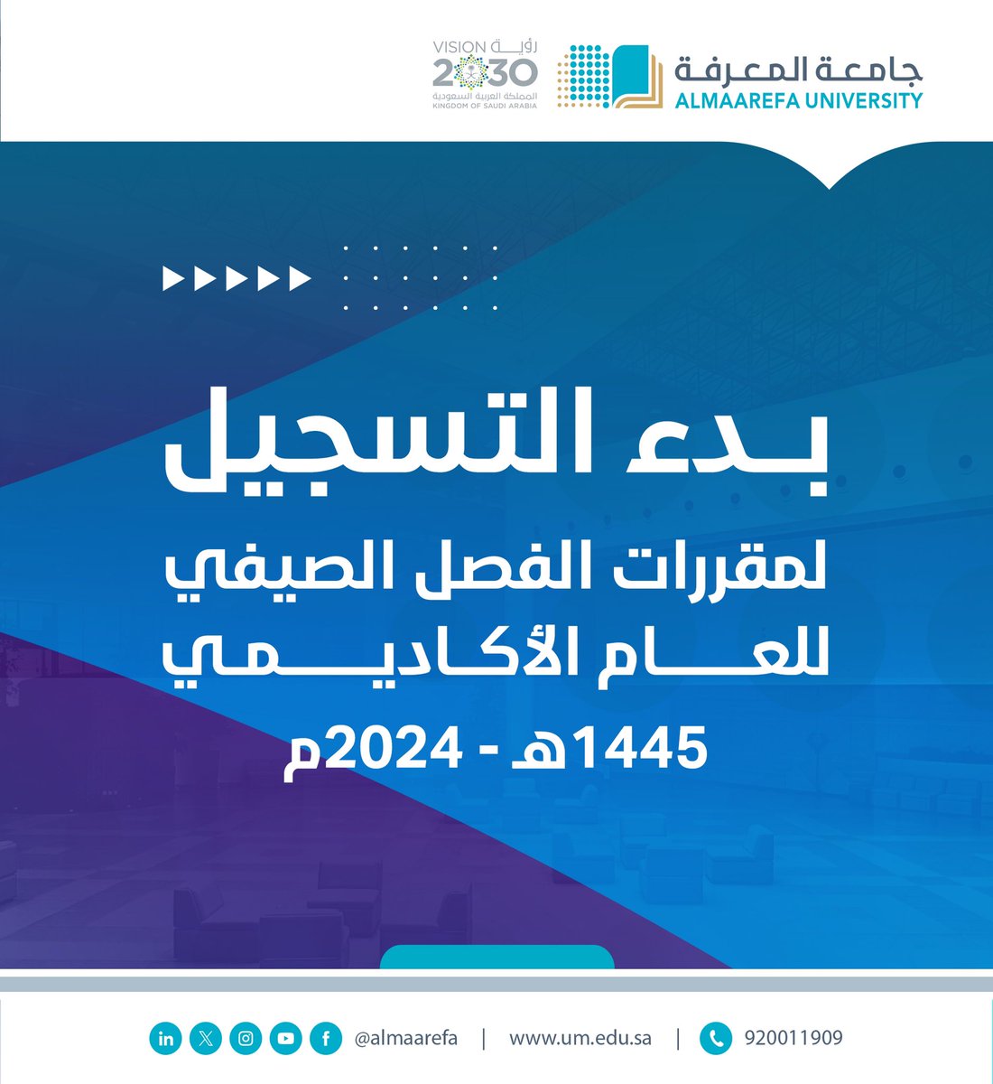 تعلن #جامعة_المعرفة عن بدء التسجيل لمقررات الفصل الصيفي للعام الأكاديمي 2024.للتقديم :https://t.co/UUUkbmvrb5@AlMaarefa pic.twitter.com/mwB1ahzoA2 — جامعة المعرفة (@AlMaarefa) June 10, 2024