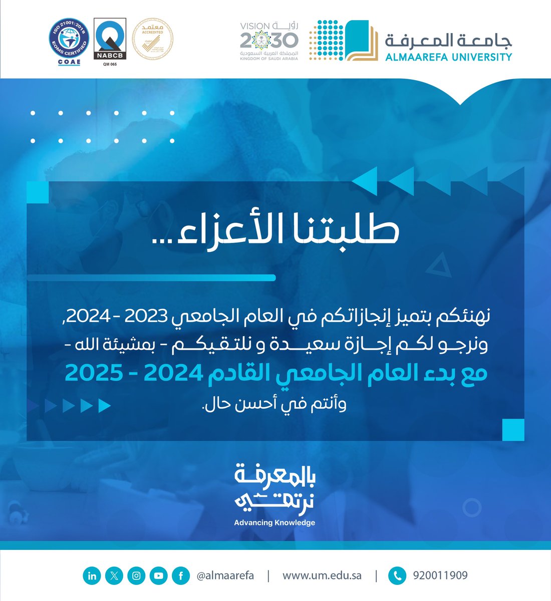 طلبة #جامعة_المعرفة الأعزاء … نهنئكم بتميز ما أنجزتم خلال العام الجامعي 2023 – 2024 . ونرجو لكم إجازة سعيدة.@AlMaarefa pic.twitter.com/69XR1CMVaq — جامعة المعرفة (@AlMaarefa) June 10, 2024