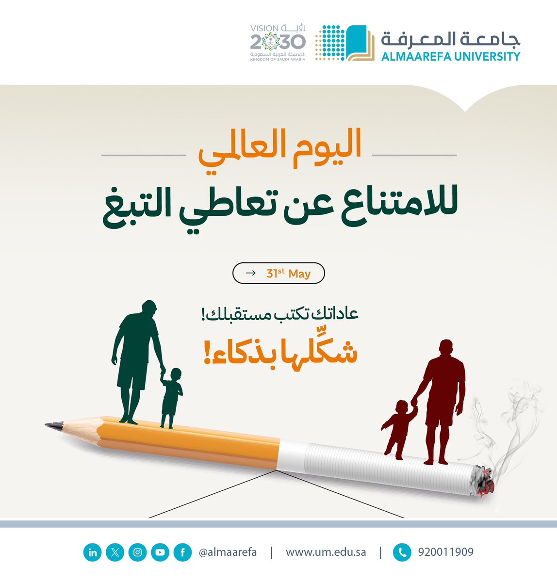 مستقبلك اختيارك. #اليوم_العالمي_لمكافحة_التدخين@AlMaarefa pic.twitter.com/AnGdREo2Vs — جامعة المعرفة (@AlMaarefa) May 31, 2024