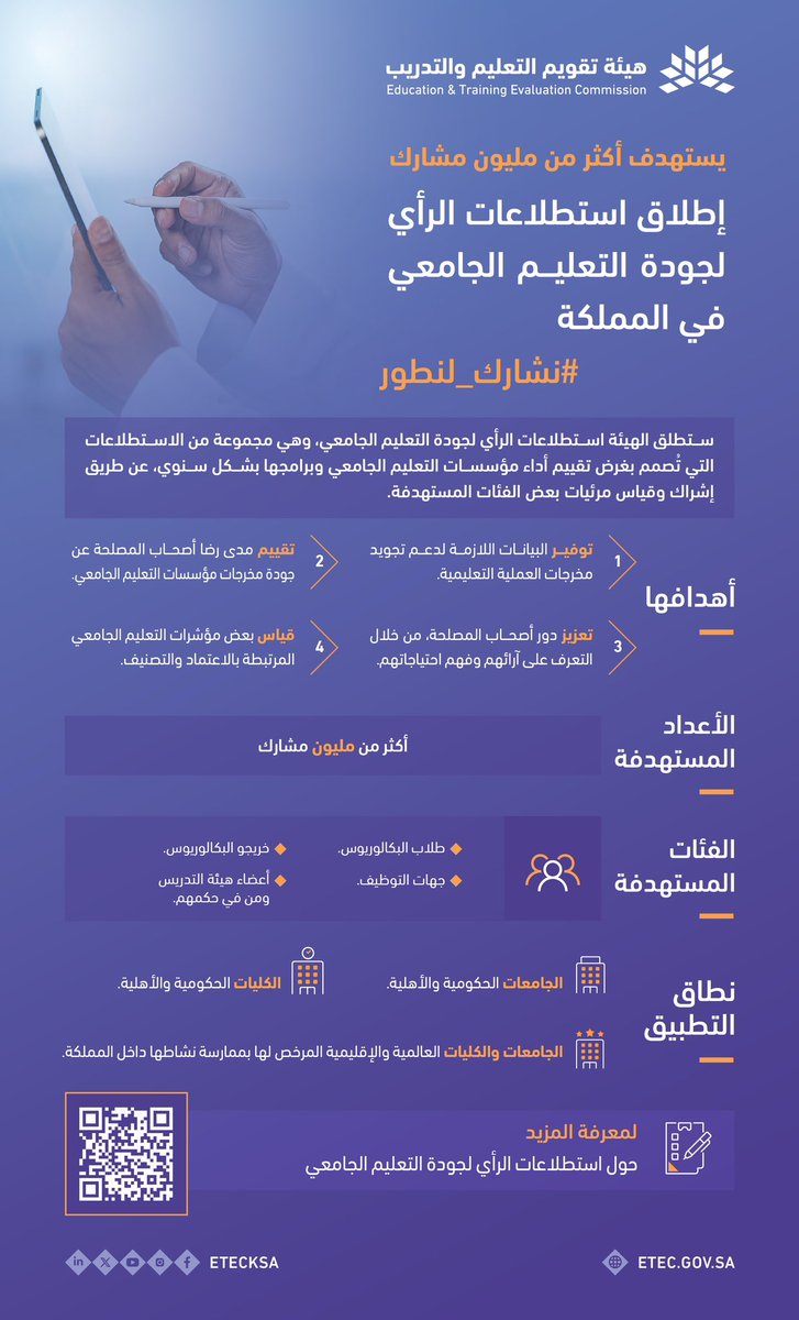 الهيئة تطلق “استطلاعات الرأي لجودة التعليم الجامعي”؛ الذي يستهدف أكثر من مليون مشارك، لدعم تقويم وتطوير مخرجات العملية التعليمية، وتقييم معارف ومهارات الخريجين واتساق وظائفهم مع تخصصاتهم، وإتاحة البيانات والمعلومات اللازمة لدعم اتخاذ القرار، وقياس بعض مؤشرات التعليم الجامعي… pic.twitter.com/eRpiINggzy …