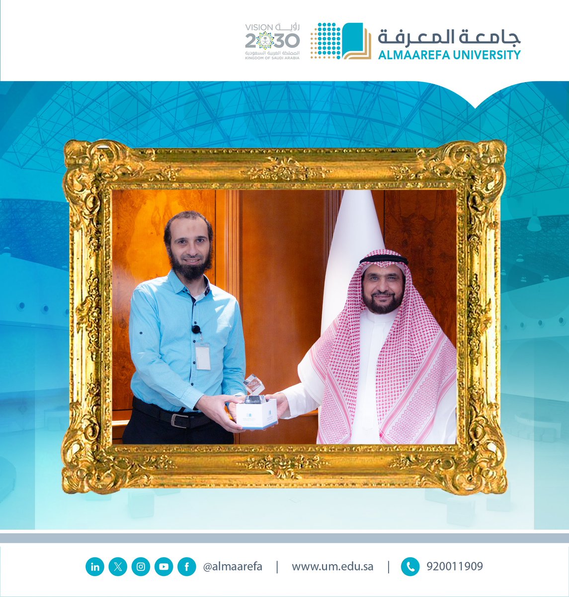 تقديرا للإنجاز المُتفرِّد المُجسِّد للتميُّز الأكاديمي لعضو هيئة التدريس في #جامعة_المعرفة، معالي رئيس الجامعة يستقبل و يُكرِّم د. منير بن عيد المدني؛ تقديرا لحصوله على #جائزة_الأمير_فيصل_بن_بندر_للتميز_والإبداع، (فئة الأستاذ الجامعي المتميز).@AlMaarefa pic.twitter.com/yk6JL8eYH0 — جامعة المعرفة (@AlMaarefa) May 8, 2024