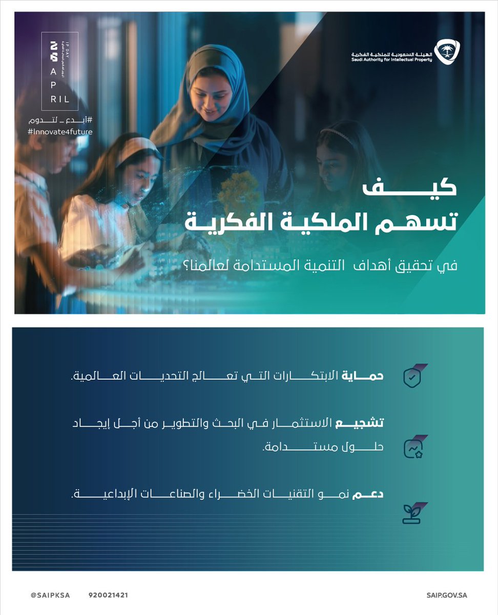النهوض بالتنمية المستدامة يتطلب أن تكون #الملكية_الفكرية جزء أساسي من حياتنا.#أبدع_لتدوم#اليوم_العالمي_للملكية_الفكرية pic.twitter.com/QIjs7LE9im — الملكية الفكرية (@SAIPKSA) April 26, 2024