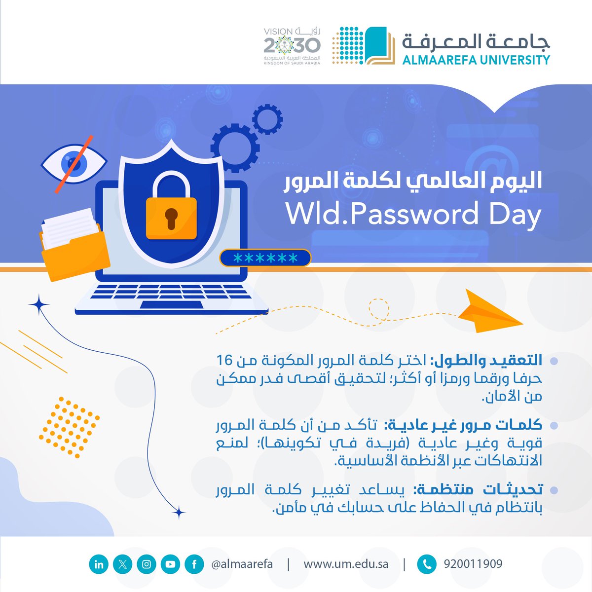 بمناسبة #اليوم_العالمي_لكلمة_المرور، قسم علوم الحاسب في #جامعة_المعرفة ينبِّه …@AlMaarefa pic.twitter.com/n3RCSqPF3l — جامعة المعرفة (@AlMaarefa) May 5, 2024