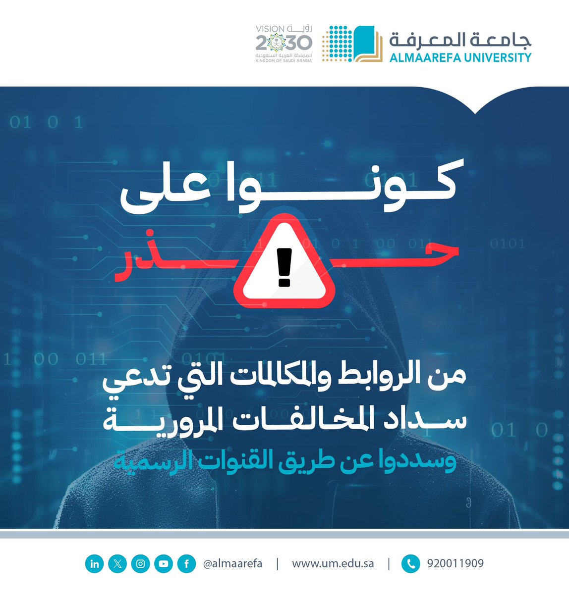 مع بدء فترة #تخفيض_المخالفات_المروريه،الأمن السيبراني في قسم علوم الحاسب في #جامعة_المعرفة ينبِّه …@AlMaarefa pic.twitter.com/3A24gSw1Aw — جامعة المعرفة (@AlMaarefa) April 18, 2024