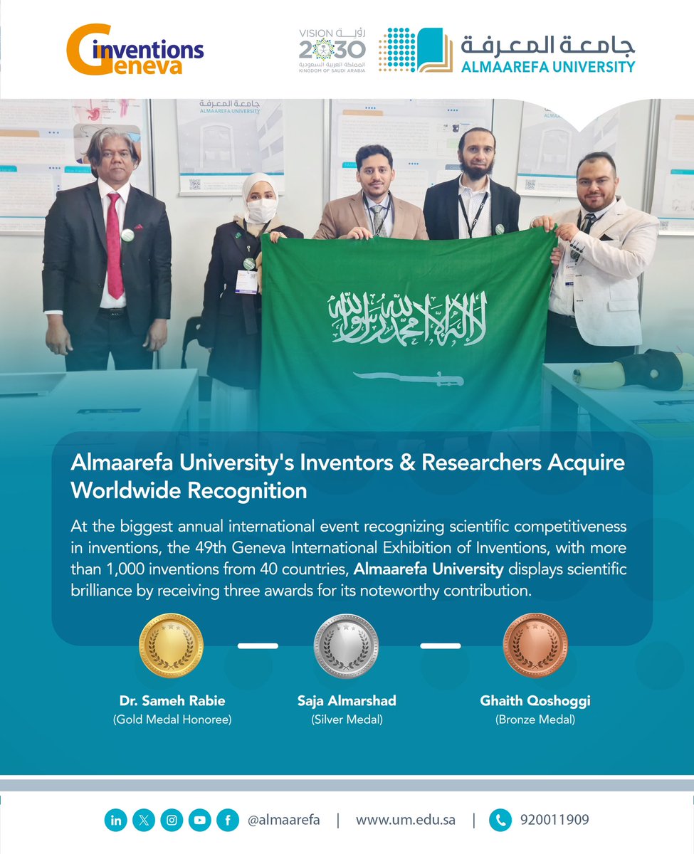 #Almaarefa_University competes on a worldwide scale with its scientific achievements at the Geneva International Exhibition of Inventions (49th); the world’s largest invention exhibition displaying economically feasible intellectual concepts.@AlMaarefa pic.twitter.com/XjPFhcpPZq — جامعة المعرفة (@AlMaarefa) April 17, 2024