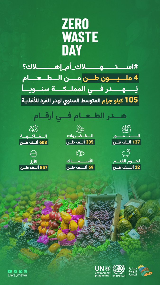 أرقام مخيفة عن الهدر الغذائي 🗑️😰ساهم بوعيك في الحفاظ على استدامة موارد بيئتك#اليوم_الدولي_للقضاء_على_الهدر #مبادرة_التوعية_البيئية pic.twitter.com/lAGFdXAs6m — مبادرة التوعية البيئية (@ENVA_mewa) March 31, 2024