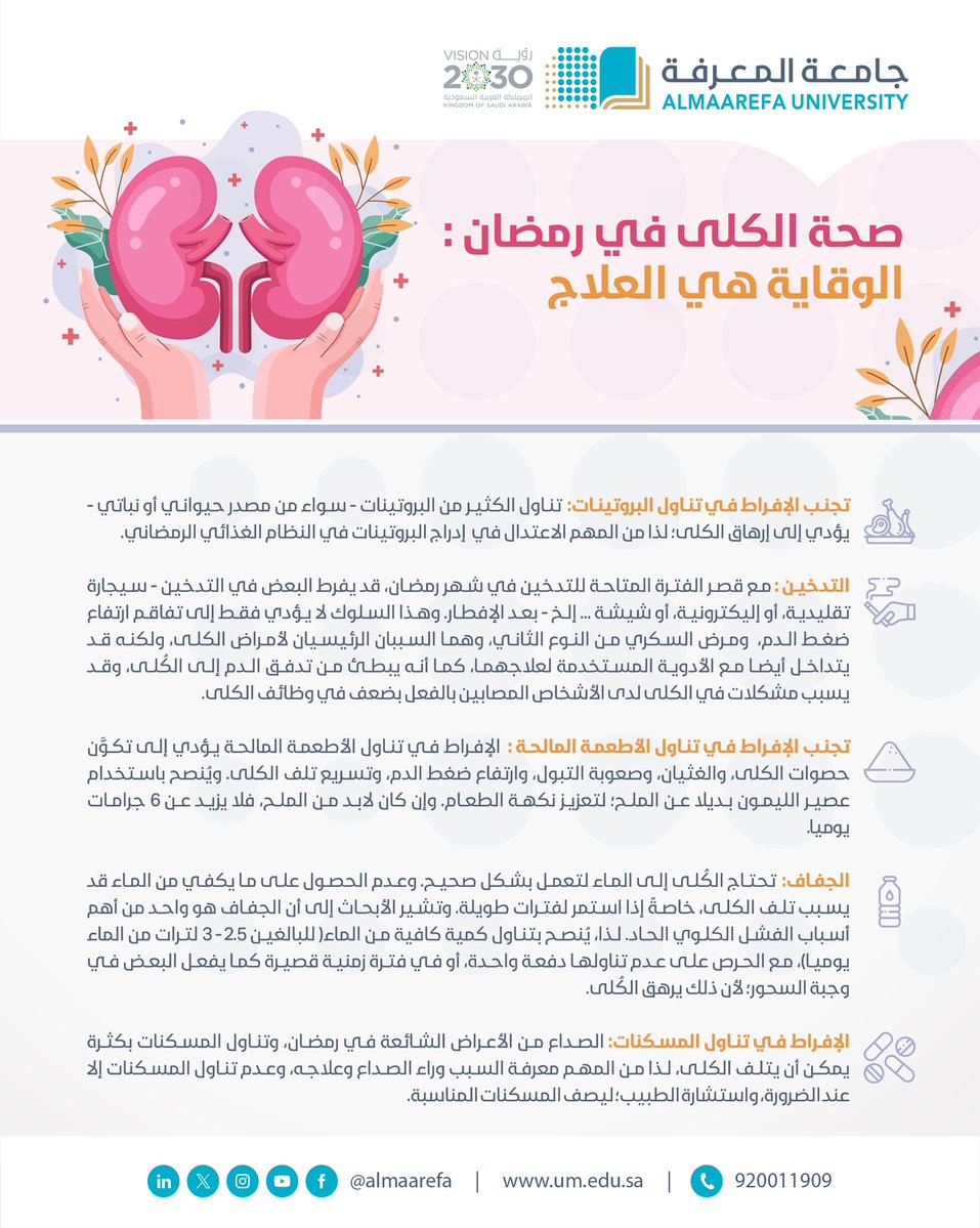 بمناسبة #اليوم_العالمي_لصحة_الكلى وقرب حلول شهر #رمضان_المبارك،كلية الطب في #جامعة_المعرفة تنبَّه … #WorldKidneyDay@AlMaarefa pic.twitter.com/DWcN9LwG8T — جامعة المعرفة (@AlMaarefa) March 13, 2024