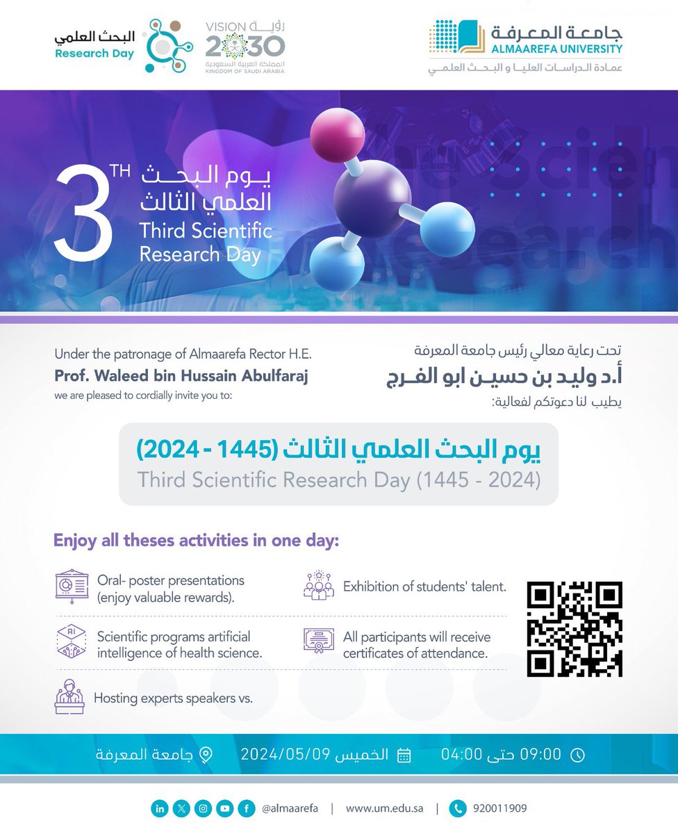 An invitation to join the forthcoming Scientific Research Day competition at @AlMaarefa. Only research abstracts regarding @AlMaarefa‘s majors will be accepted. Students, graduates of @AlMaarefa, and all university students in Saudi Arabia are welcome to apply. To register &… pic.twitter.com/rGrmpMEkkf …