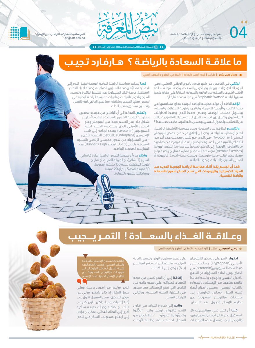 في #اليوم_الدولي_للسعادة، طالبا #جامعة_المعرفة في حديث عن علاقة الرياضة بالسعادة، وعلاقة الغذاء بالسعادة: pic.twitter.com/B7UkdOunWx — جامعة المعرفة (@AlMaarefa) March 20, 2024