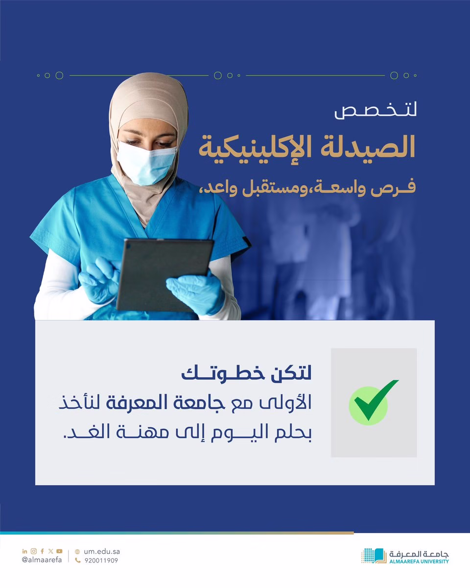 يعد تخصص #الصيدلة_الإكلينيكية من التخصصات التي توفر فرصًا واسعة ومستقبلًا مهنيًا واعدًا.⁰ابدأ خطواتك الأولى مع #جامعة_المعرفة لتحقيق حلمك المهني في هذا المجال الرائد.للتسجيل :https://t.co/wlUeFRszEP pic.twitter.com/vPMU6HQNfF — جامعة المعرفة (@AlMaarefa) December 10, 2024